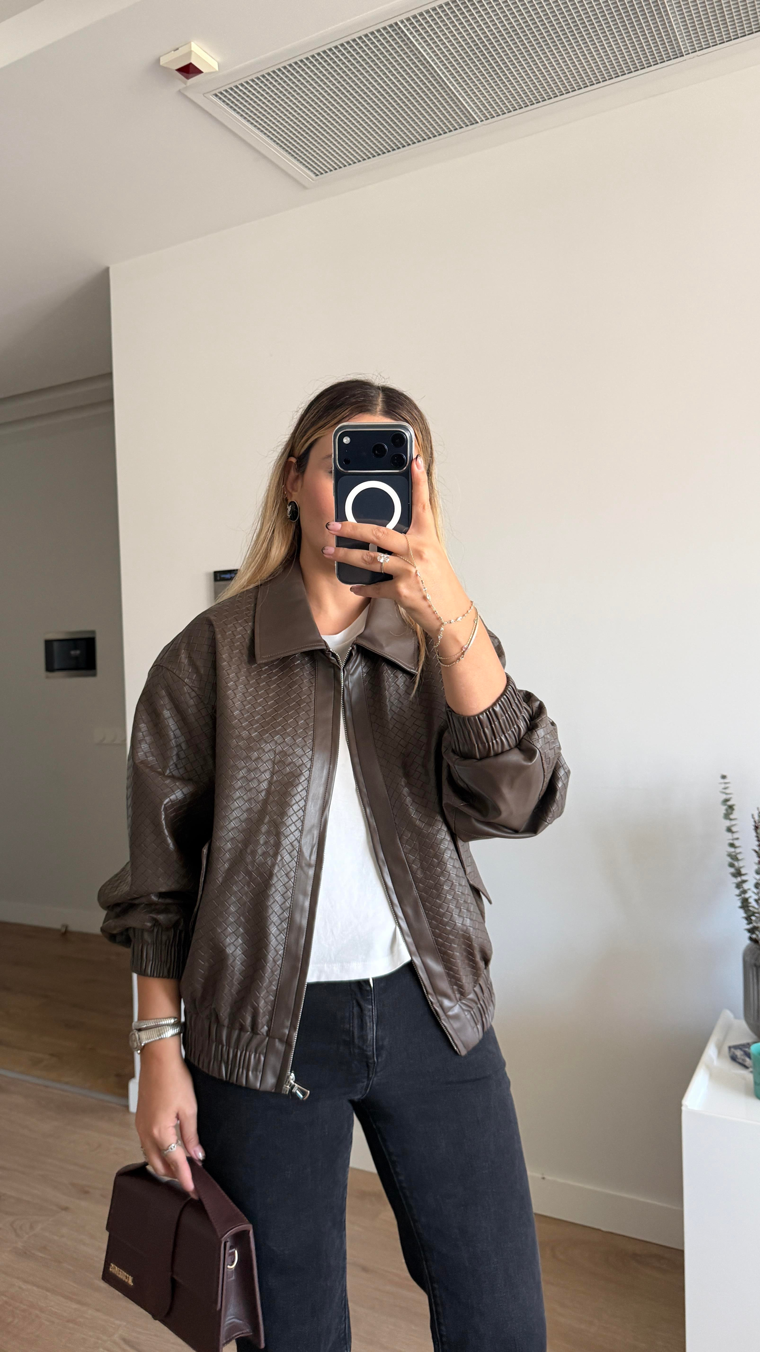 • Renk: KAHVE • Kumaş/Dokuma: Deri görünümlü, ince desenli dokuma yüzey • Kalıp: Rahat kesim (hafif oversize) • Yaka: Klasik düz yaka • Kapanış: Önden tam boy fermuarlı • Cep Detayı: Yanlarda kapaklı cep detayları • Bel ve Bilekler: Lastikli ribana tasarım – bedene oturarak rüzgarı keser • Kol: Uzun kol, hafif bol formda • Astarlama: İç kısmı astarlı, konforlu kullanım sağlar • Stil: Günlük şıklık, casual ve smart-casual kombinlere uyumlu • Mevsim: İlkbahar – Sonbahar – Ilıman kış günleri için uygun • Bakım: Yalnızca kuru temizleme önerilir (gerçek deridir)