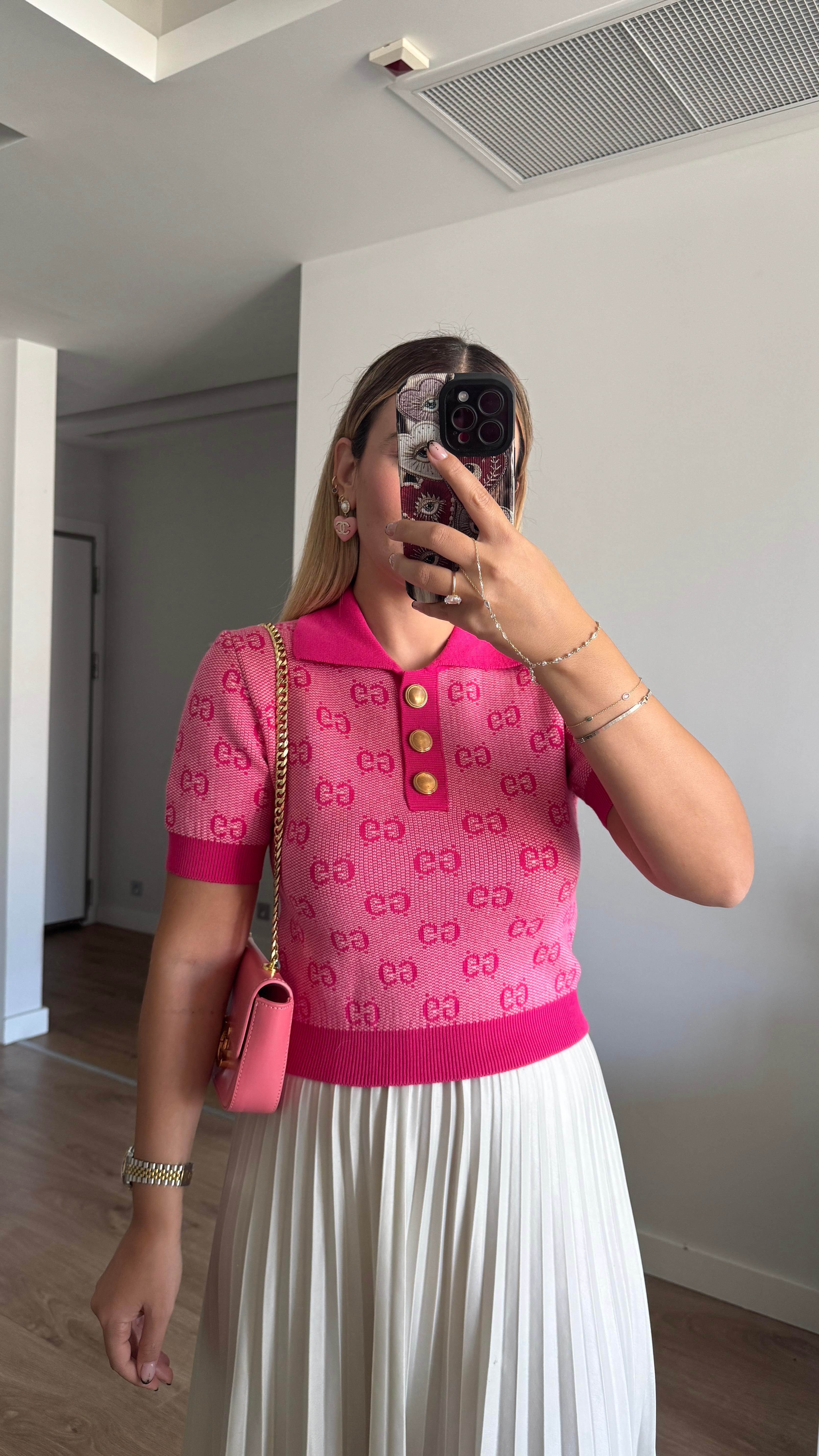 Üst Parça⬇️ • Canlı fuşya tonlarında, kısa kollu triko bluz. • Ön kısmında altın renk detaylı düğmeler ve polo yaka kesimi bulunuyor. • Üzerindeki desenler ürüne lüks bir dokunuş katıyor. • Esnek kumaş yapısı sayesinde vücuda oturur ve konfor sağlar.