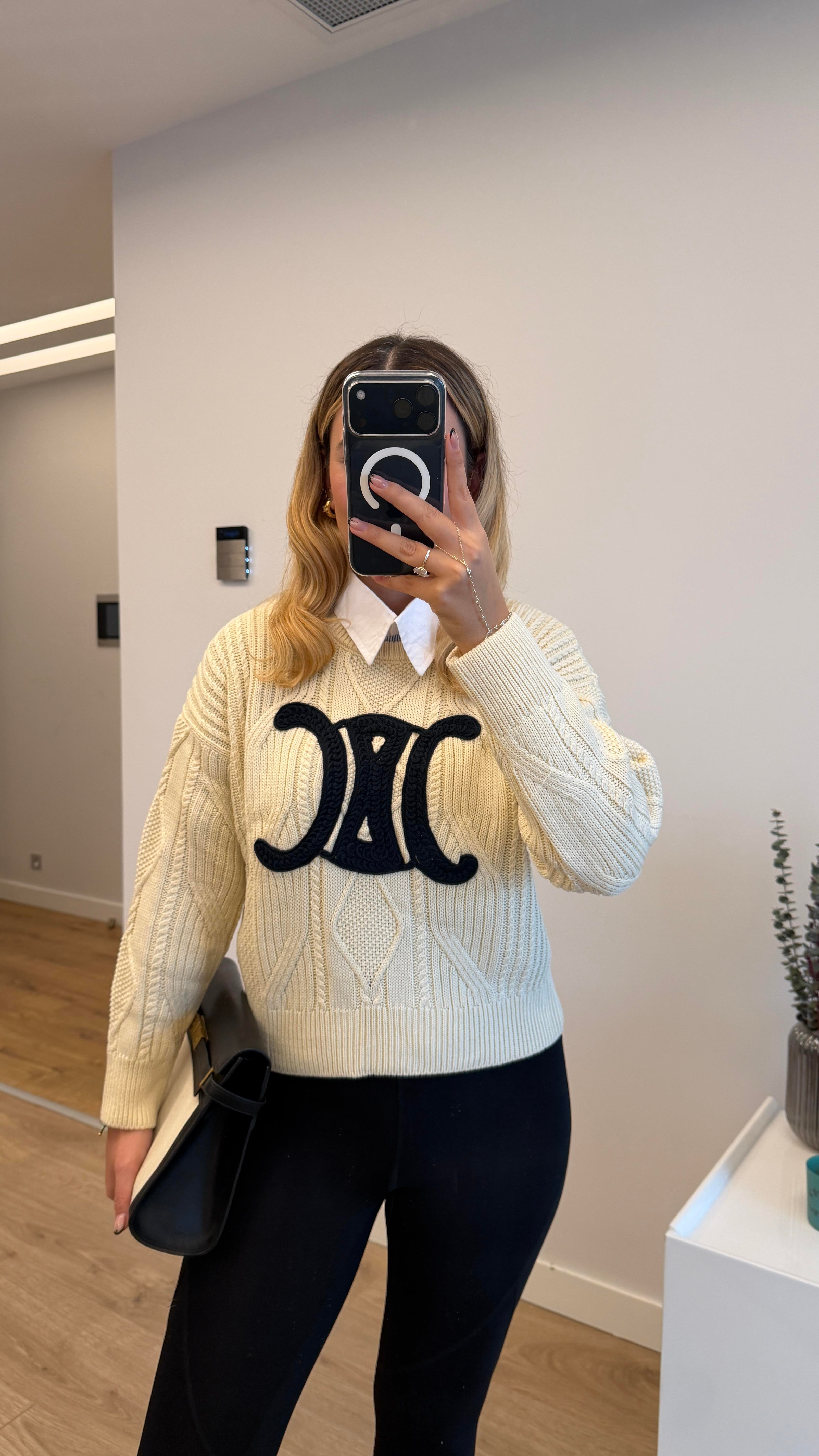 Göğüs kısmında siyah renkte, kalın örgü ile işlenmiş büyük Celine Triomphe logosu bulunuyor.
