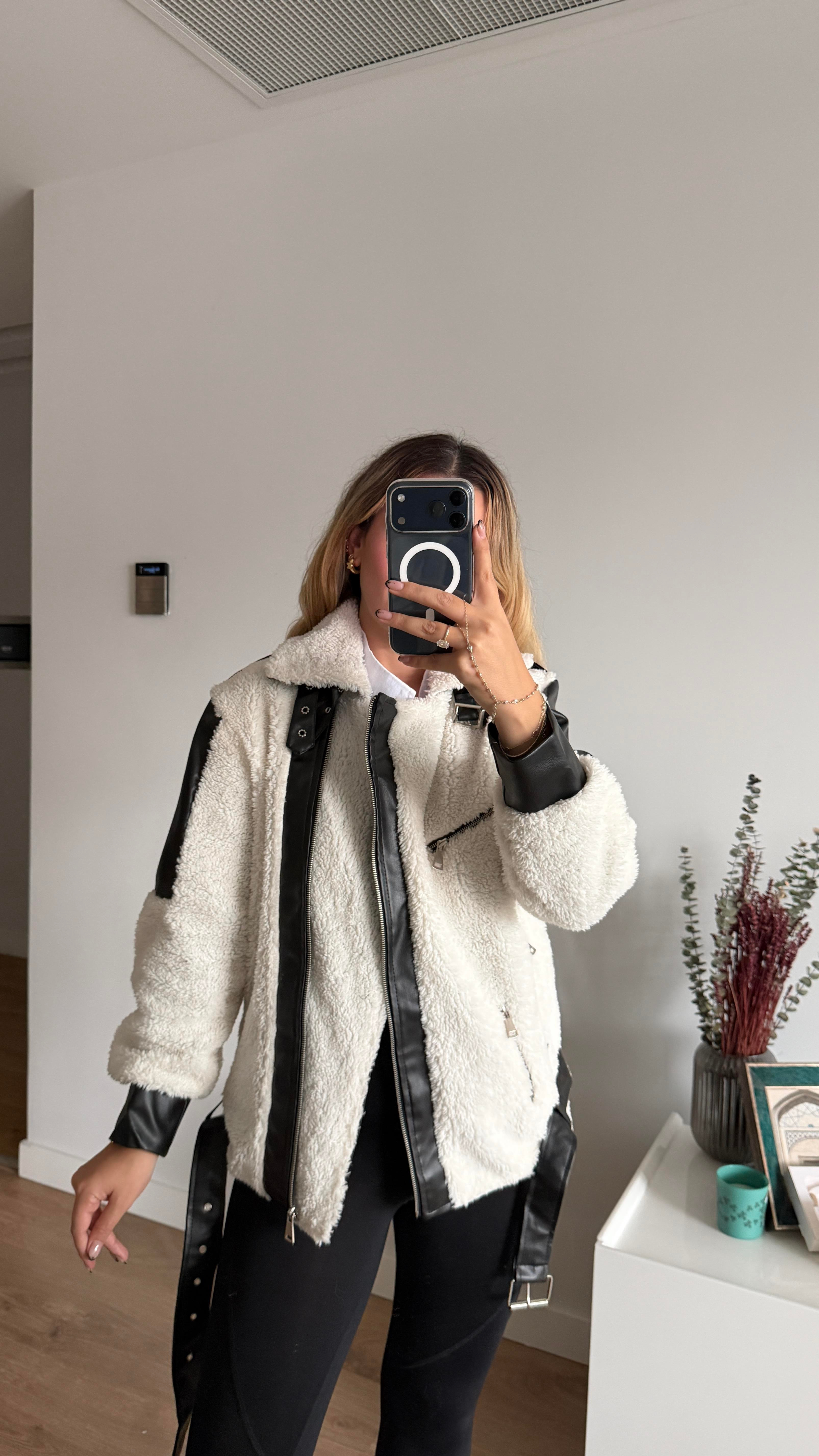 Malzeme: Beyaz teddy/kürk kumaş, siyah deri detaylı kollar, fermuar kenarları ve bel kısmı.